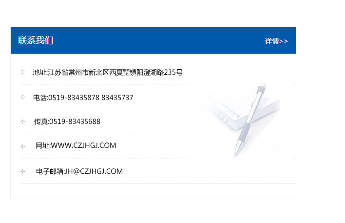 傳真:0519-83435688    郵編:213135    網址:WWW.czjhgj_com.jlt-sy.com    電子郵箱:JH@czjhgj_com.jlt-sy.com